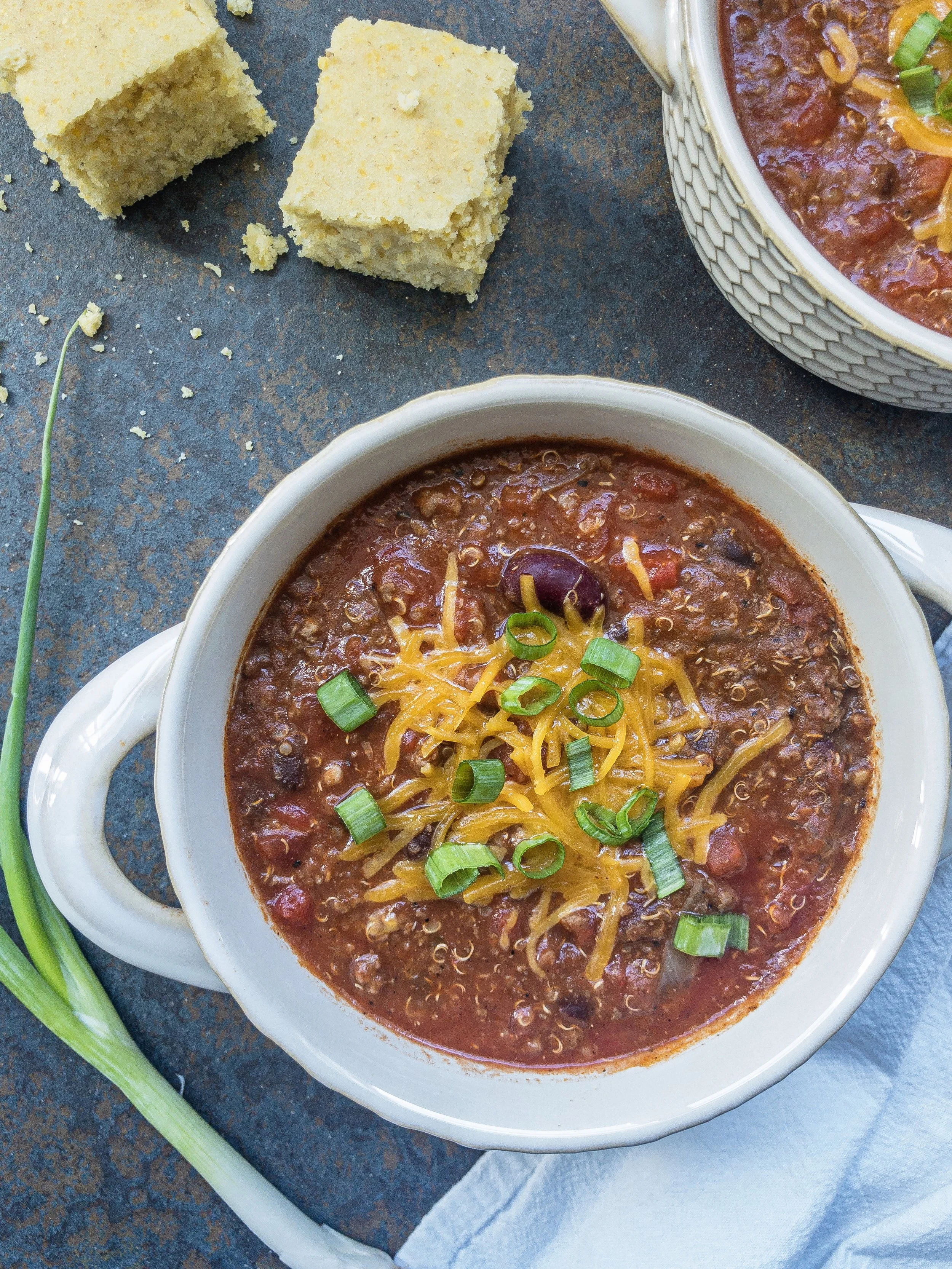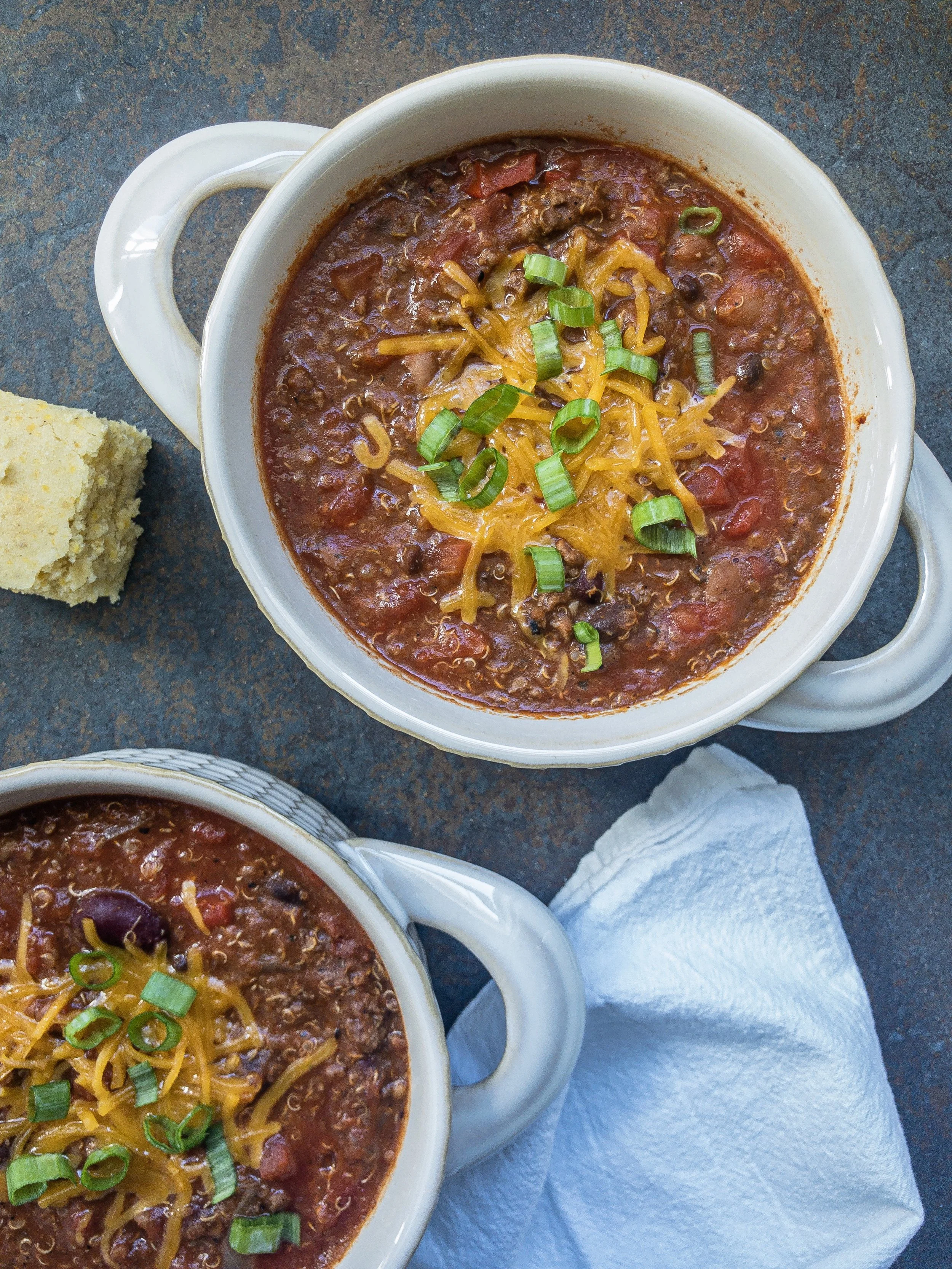 *Not sure what to top your chili with? Here are some ideas: cheddar cheese, green onions, avocado, sour cream or plain greek yogurt, cilantro, limes, bacon, corn, jalapeños, tomatoes, cornbread